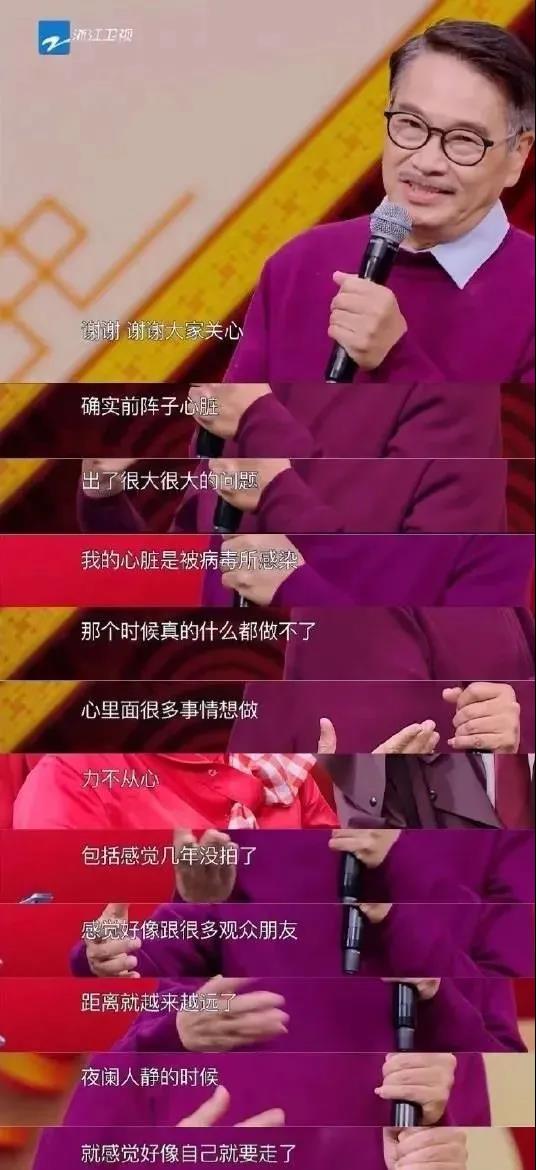 在不久前播出的《王牌对王牌》节目中,吴孟达也曾向观众坦言:“前阵子,心脏出了很大很大的问题。我的心脏是被病毒所感染,那时候真的有很多事想做,可是力不从心。几年没拍戏了,感觉和很多观众朋友距离越来越远了。”